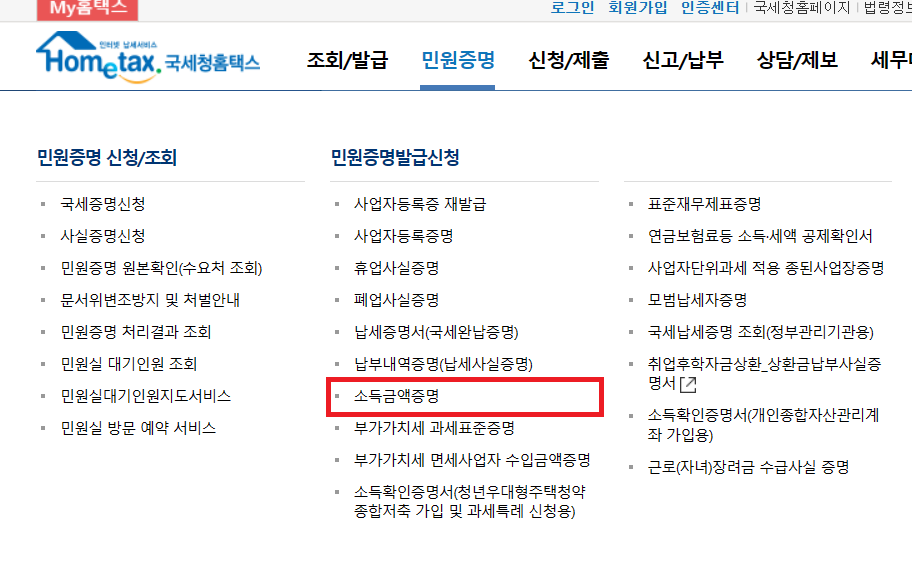홈텍스에 접속한 후 민원증명발급 탭에서 ‘소득금액증명’을 선택해주세요.