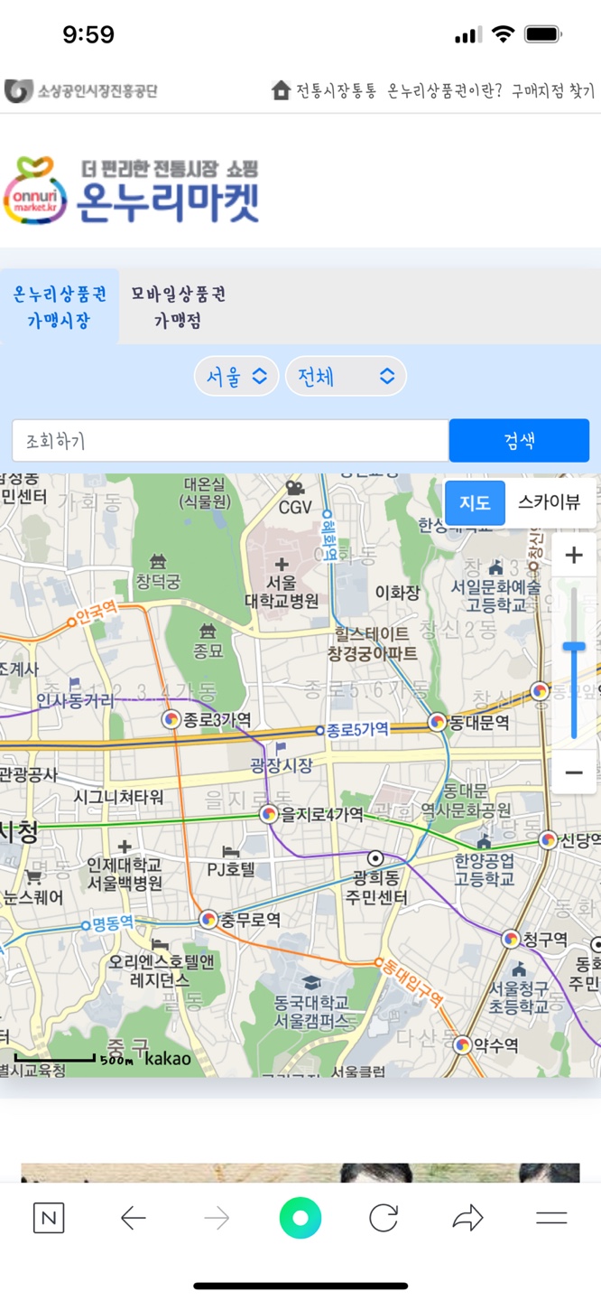 온누리 마켓에 들어간 후 지역을 선택하여 검색하면 해당 지역에서 사용할 수 있는 전통시장이 모두 검색됩니다.