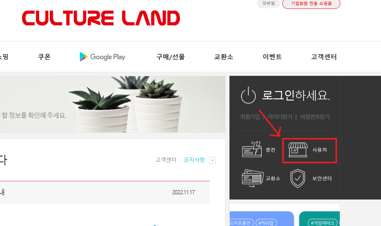 문화상품권 사용처는 켤쳐랜드 사이트에서 확인할 수 있습니다.