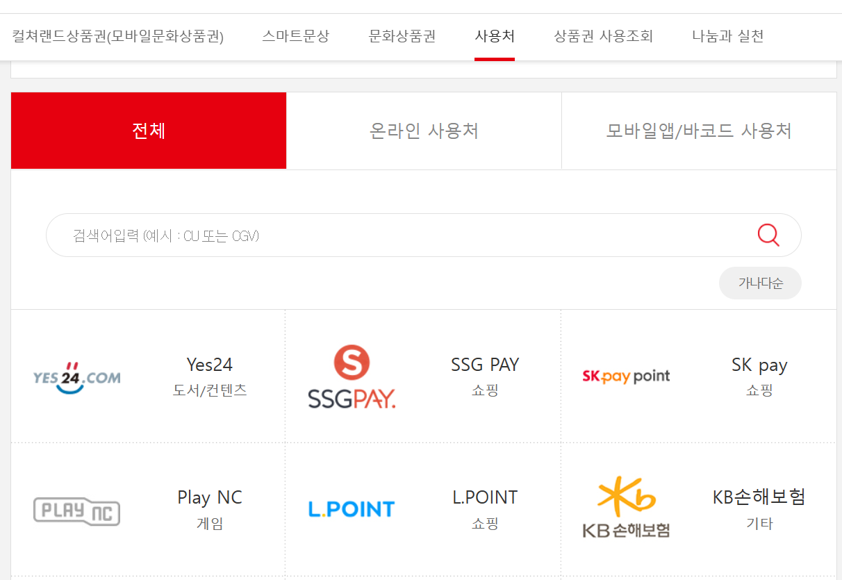 켤쳐랜드 문화상품권 사용처는 켤쳐랜드 사이트에 접속하여 사용처에 들어가 보면 검색을 통해 알 수 있습니다. 전국의 수만 개의 온/오프라인 매장에서 사용할 수 있으며 네이버 페이, 쓱 머니, 스마일 캐시 등의 포인트로도 전환이 가능하니 유용하게 사용하실 수 있을 것 같아요.
