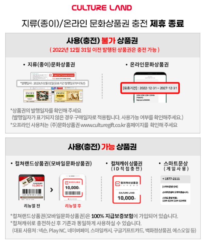2023년부터 지류/온라인 문화상품권은 제휴가 종료되어 충전이 불가능하다고 하니 참고하셔야할 것 같아요. 상품권의 발행일자를 확인하고 2022년 12월 31일 이전 상품권만 충전이 가능하다고 합니다.