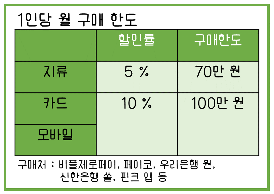 또한 1인당 월 구매 한도가 기존 대비 지류는 50만 원에서 70만 원으로 카드, 모바일은 70만 원에서 100만 원으로 20~30만 원 정도 확대됐기 때문에 이번 1월에 카드나 모바일형 온누리상품권은 최대 100만 원을 구매한다고 하면 90만 원에 살 수 있습니다.