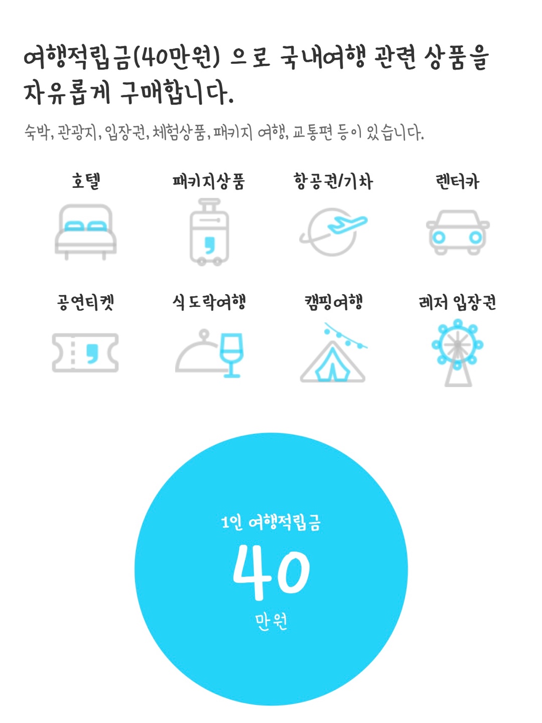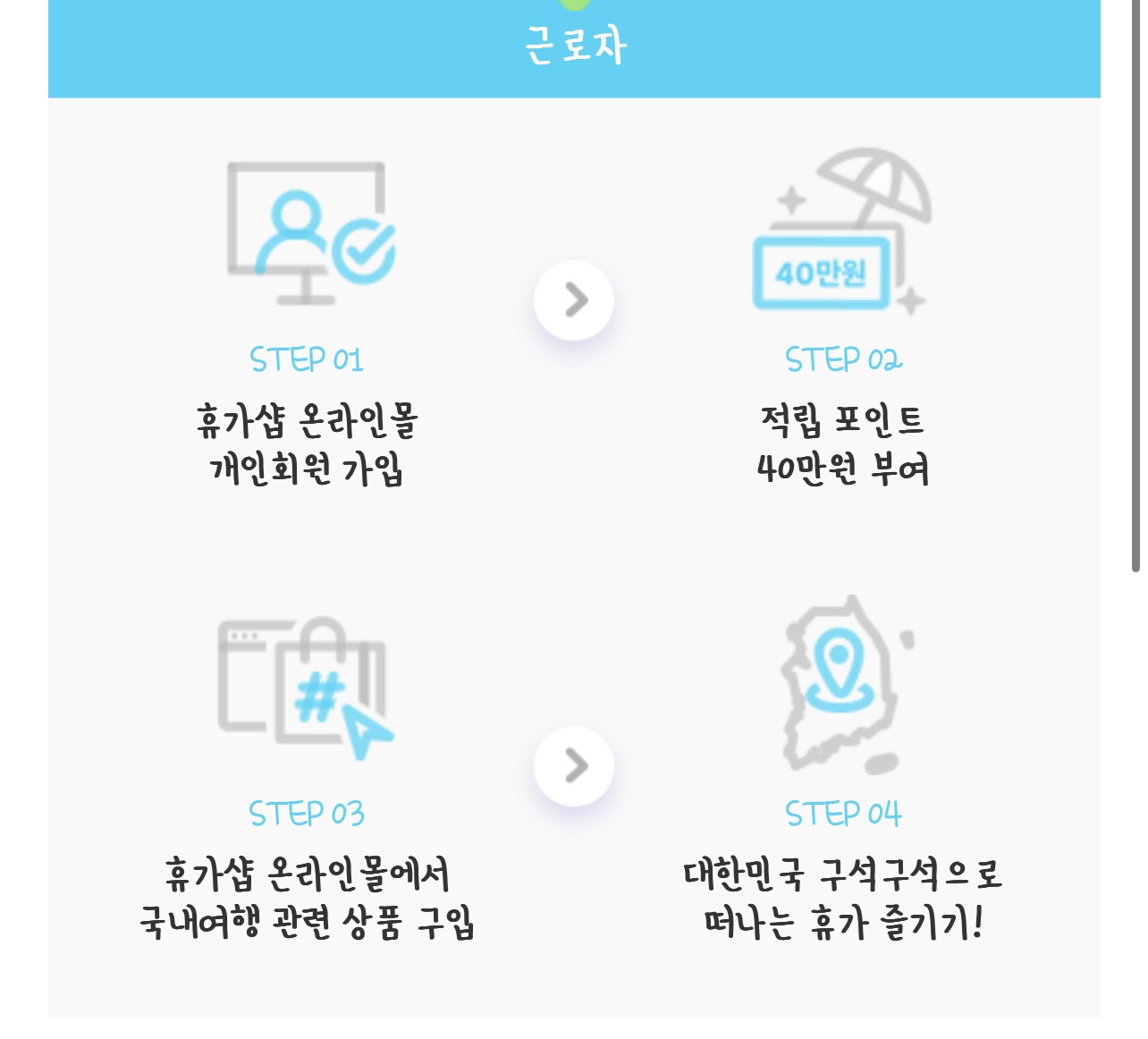 근로자 휴가지원사업에 참여하게 되면 휴가샵 온라인몰에 40만원 포인트 부여를 합니다. 그리고 이 휴가샵 온라인 몰을 통해 근로자 휴가비 지원을 적립금 형태로 받습니다. 그리고 이걸 이용해 국내 여행 관련 상품을 구입하는 형태로 사용할 수 있습니다.