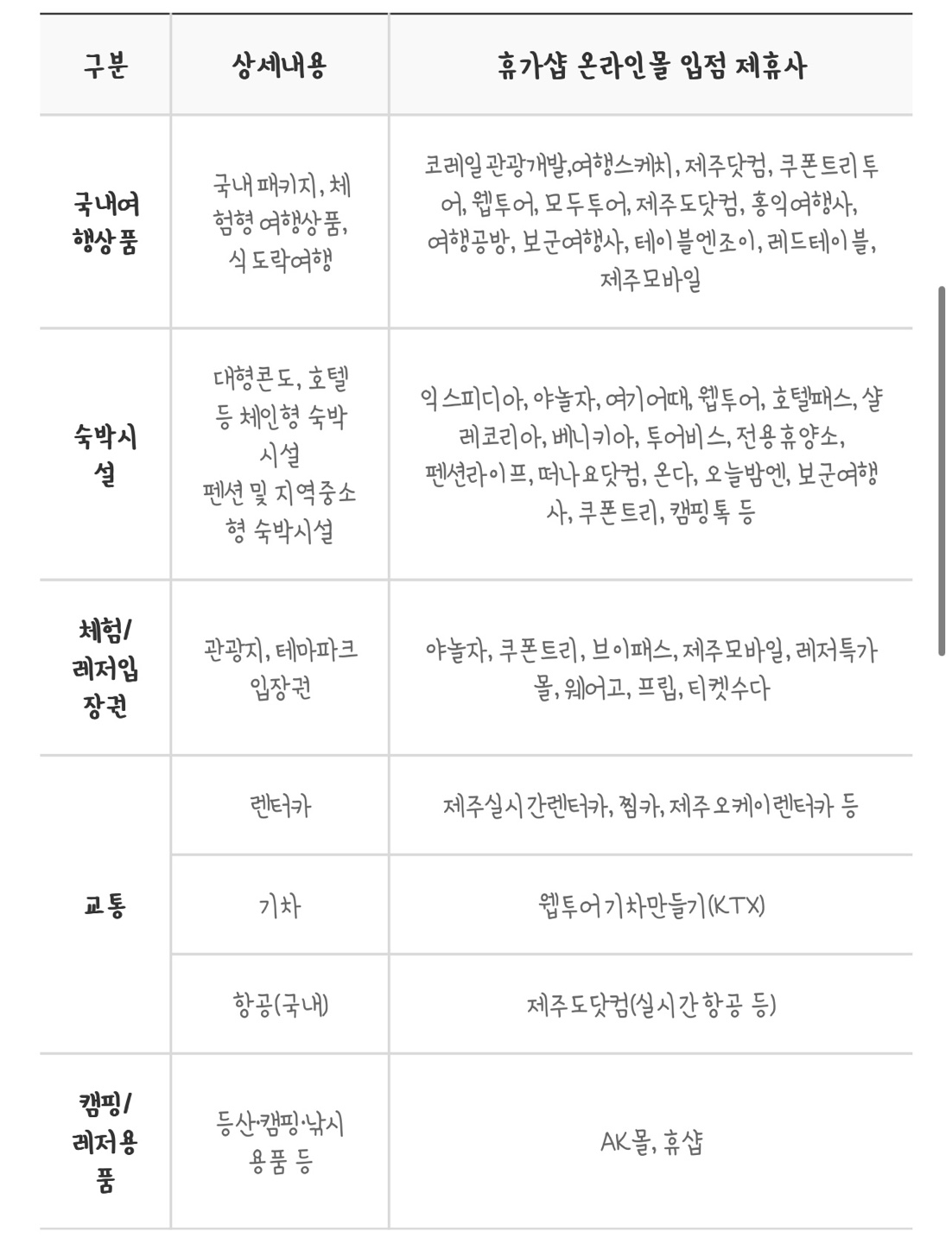 그렇다면 휴가샵이 무엇인지 궁금하시죠. 휴가샵이란 참여근로자들만을 위한 폐쇄몰로 운영되고 있는 근로자 휴가지원사업 전용 온라인몰입니다. 휴가샵 내에는 약 40개의 제휴사, 10만여개의 상품이 있으며, 숙박시설, 국내패키지 상품, 레저입장권, 교통편(렌터카, 기차, 항공), 도락상품등 다양한 국내여행 관련 상품을 빠르게 구매할 수 있습니다. 향후 지속적으로 여행사 제휴 및 상품 확대를 진행한다고 하니 기대가 됩니다.