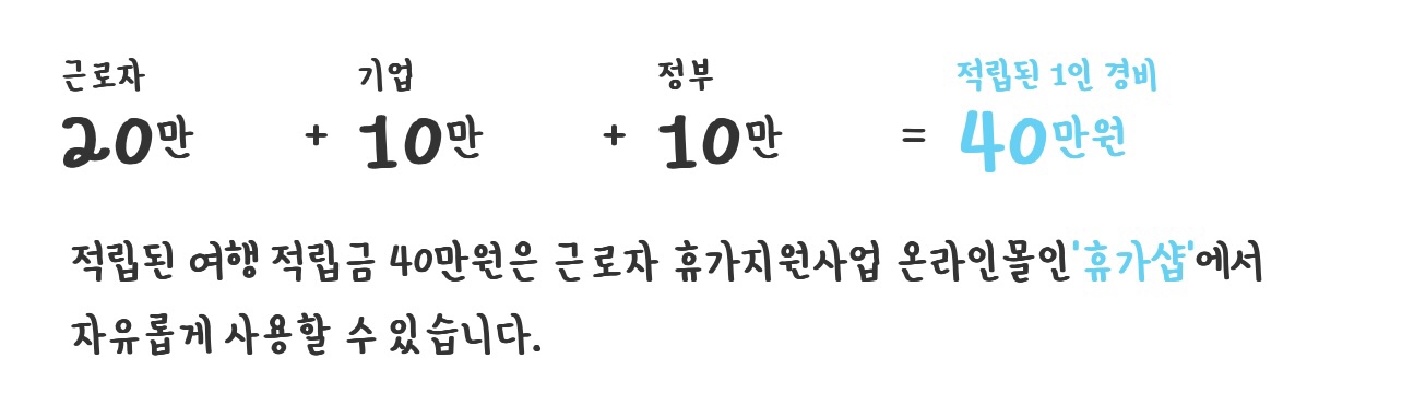 휴가비는 총 40만 원을 조성해 근로자에게 지원합니다. 먼저 정부가 10만 원을 내고, 기업이 10만 원을 낸 뒤 근로자는 20만 원을 분담해 모두 40만 원의 적립금을 만듭니다.
