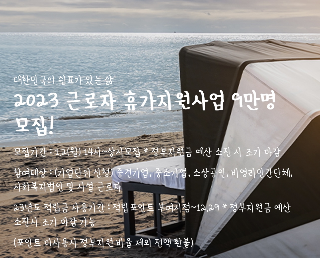 모집기간은 2023년 1월 2일부터 정부지원금 예산 소진 시까지 상시 모집하고 있고 중견기업, 중소기업, 소상공인, 비영리민간단체, 사회복지법인 시설 근로자 총 9만여 명이 그 대상입니다. 23년도 적립금 사용시간은 적립포인트 부여시점부터 2023년 12월 29일까지인데 정부지원금 예산 소진 시 조기 마감 가능하니 얼른 신청해야 겠네요.