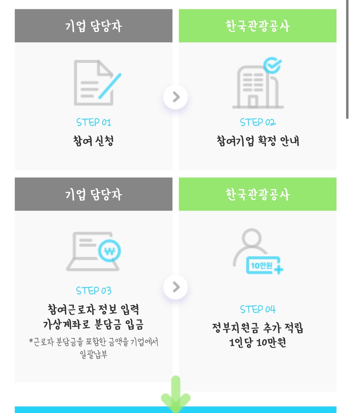 근로자 휴가지원사업은 정부와 기업이 함께 근로자의 국내 여행경비를 지원하는 사업으로 직장 내 자유로운 휴가 문화 조성과 국내여행 활성화를 위해 정부와 기업이 함께 근로자의 국내여행 경비(휴가비)를 지원합니다. 한국형 체크바캉스 제도(프랑스 국민여행 장려제도)로 14년 시범사업을 걸쳐 18년부터 꾸준히 사업을 확장해오고 있습니다.