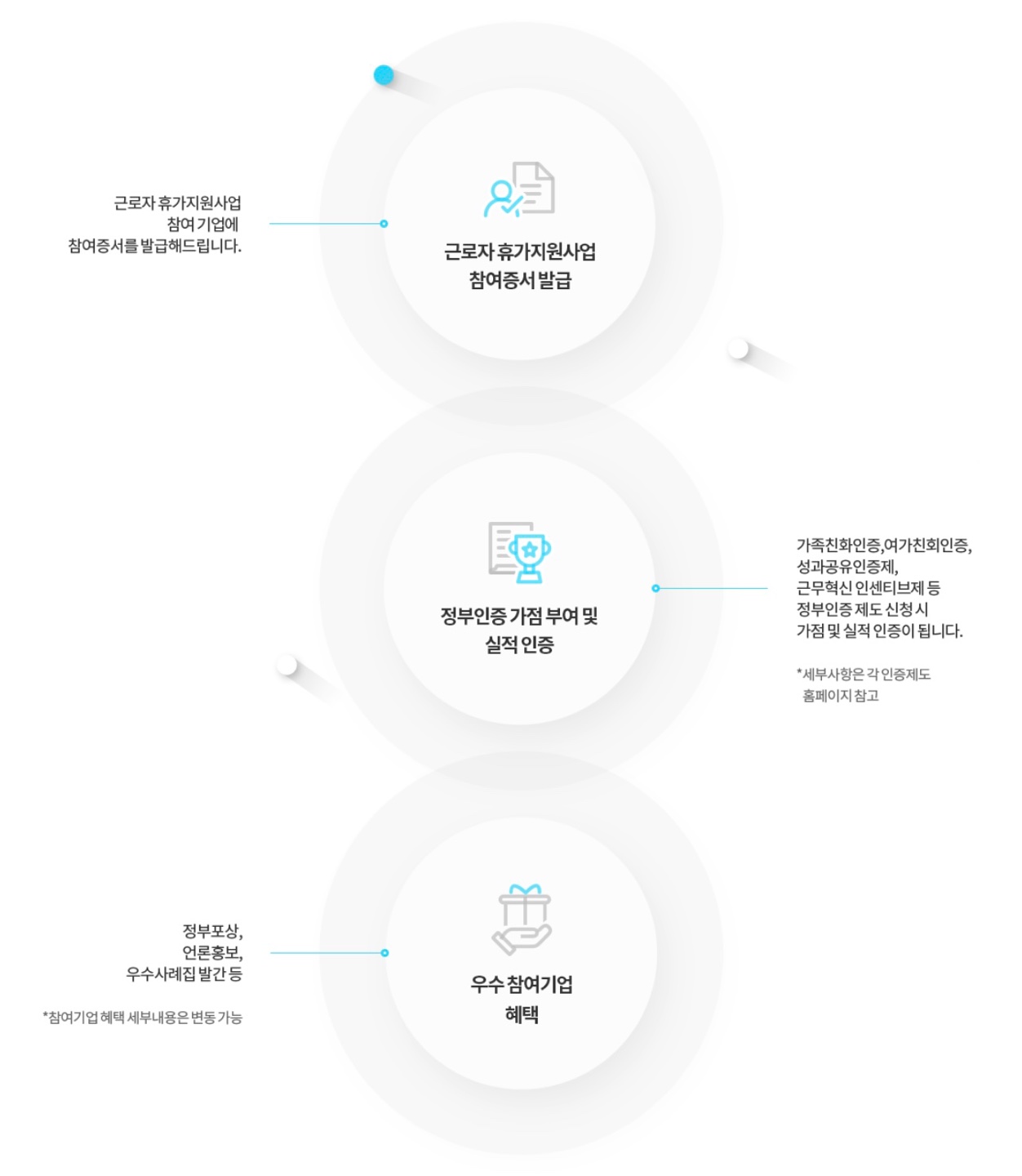 | 정부인증 가점부여 및 실적 인정 | 가족친화인증(여성가족부) 혜택 | 관할부처 : 여성가족부 가족문화과 23년 신청기간 : 4월~6월 근로자휴가지원사업 참여기업 혜택 : 가점 부여(2점) *점수미정 선정기업 지원내용 : 조달청 입찰 시 가산점, 기업당 1명 법무부 출입국 우대카드 발급 참고사항 : 23년 참여증서 필요, 지원대상 - 중소기업 |