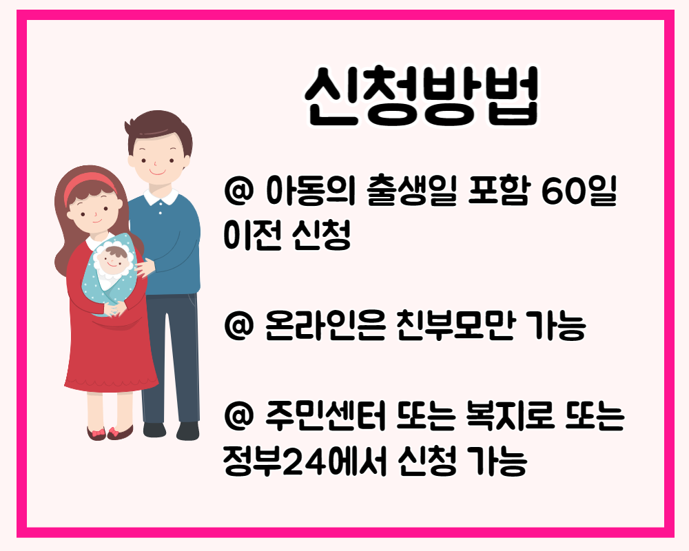 아동의 주민등록상 주소지 읍·면·동 주민센터로 방문신청하거나 복지로(www.bokjiro.go.kr) 또는 정부24(www.gov.kr) 누리집(홈페이지)을 통해 온라인으로 신청할 수 있는데요. 온라인 신청은 아동의 보호자가 친부모인 경우에만 가능합니다. 부모가 방문 신청할 경우 주소지 무관 전국 주민센터에서 신청 가능합니다.