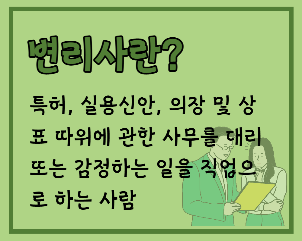 어학 사전에는 [특허, 실용신안, 의장 및 상표 따위에 관한 사무를 대리 또는 감정하는 일을 직업으로 하는 사람.]이라고 표현되어 있는데요. 산업재산권(특허권, 실용신안권, 디자인권과 상표권) 전반에 걸친 지식을 갖추어 출원, 심판, 감정, 소송 등 전반적인 절차를 대리하는 전문직 자격을 갖춘 사람을 말합니다. 예전에는 변호사들이 하던 일인데 요즘은 지식재산권으로 인한 분쟁이 많아지면서 나의 지적재산 권익을 보호하기 위해 특허권 등을 신청할 때 이런 업무를 대신 수행하는 전문가가 변리사라고 생각하시면 됩니다.