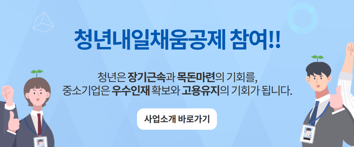 - 최소 2년 동일 사업장에서 근무하면서 실질적 경력형성의 기회를 가질 수 있습니다.- 만기 후 중소벤처기업부의 내일채움공제(3~5년)로 연장가입 시 최대 8년의 장기적인 목돈마련이 가능합니다.