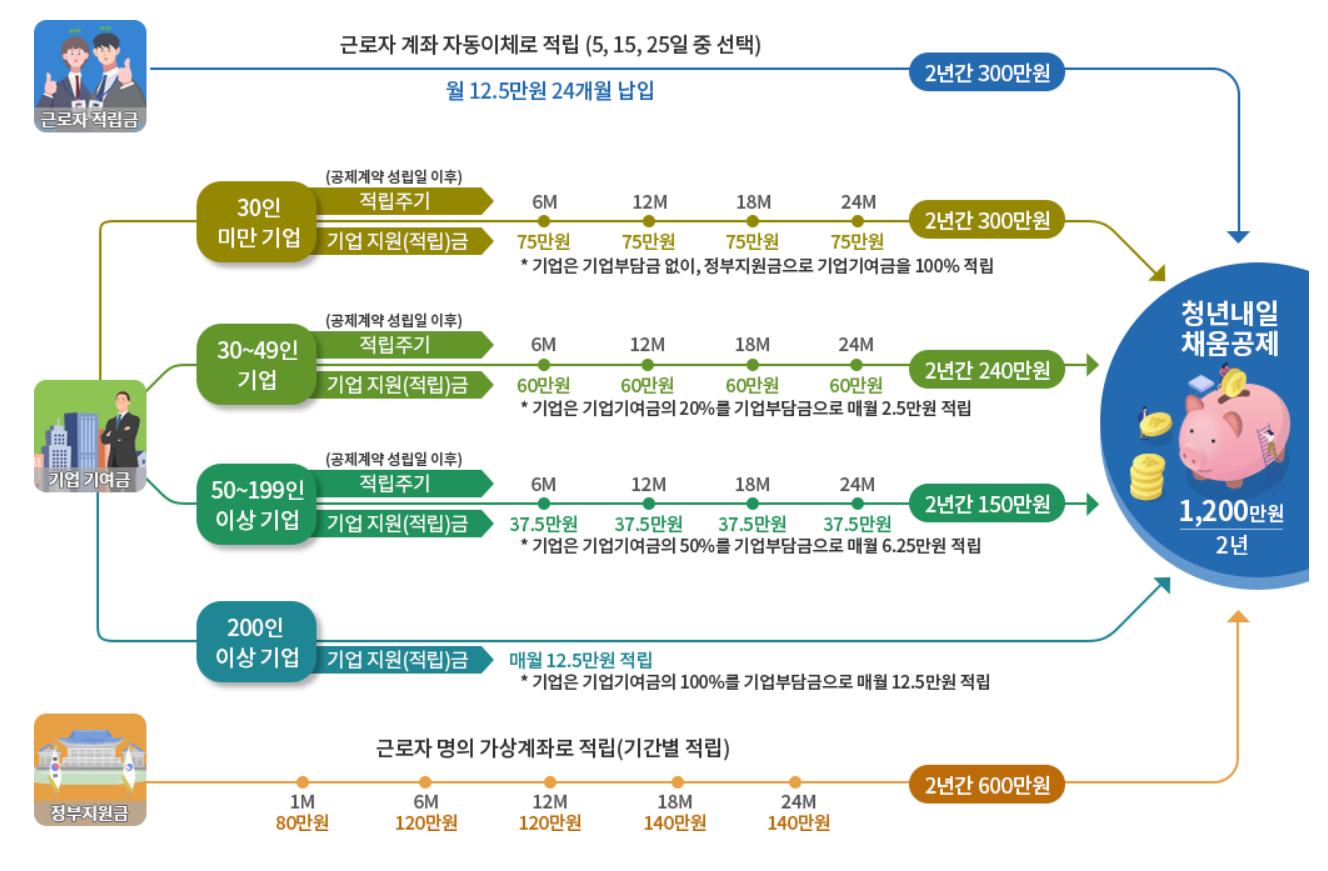 청년 본인이 2년간 400만원(매월 16만 6천원)을 적립하면 정부(취업지원금 400만원)와 기업(400만원, 정부지원)이 공동 적립