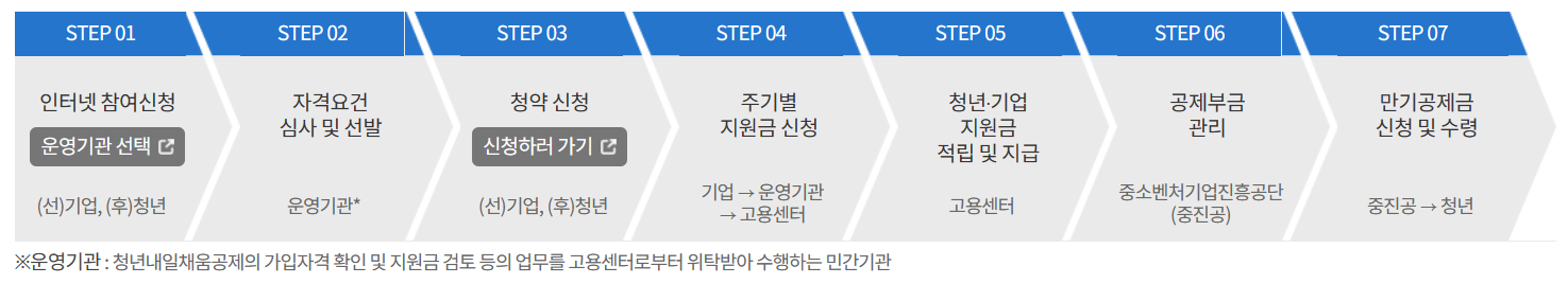 워크넷-청년공제 홈페이지(www.work.go.kr/youngtomorrow)에서 참여를 신청할 수 있고, 운영기관의 자격심사에 따른 워크넷 승인이 완료되면 청년공제 청약 홈페이지(www.sbcplan.or.kr)에서 청약 신청하시면 됩니다.