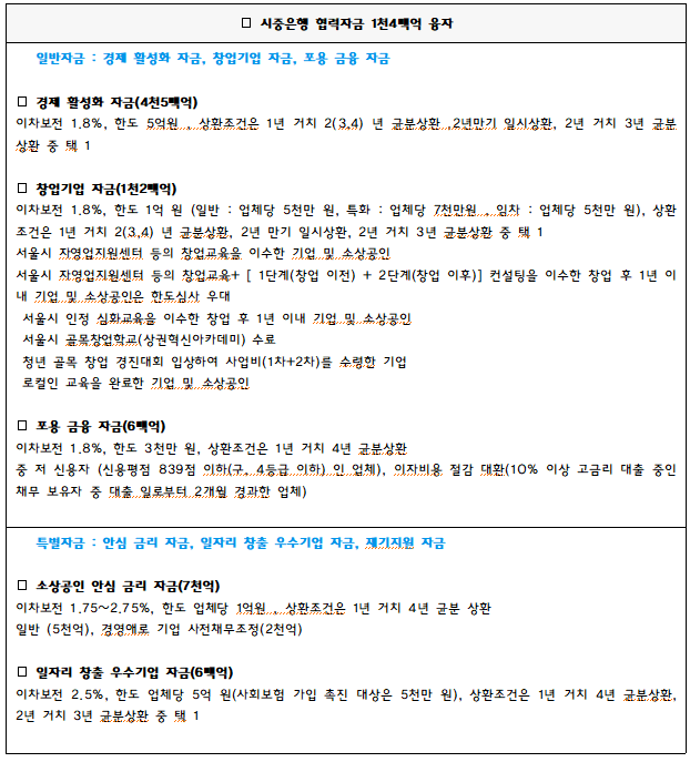 시중은행 협력 자금은 총 1천4백억으로 일반자금(경제 활성화 자금, 창업기업 자금, 포용 금융 자금), 특별자금(안심 금리 자금, 일자리 창출 우수기업 자금, 재기 지원 자금)으로 구분됩니다. 특히 소상공인의 부담을 덜기 위해 처음 공급되는 소상공인 지원금인 안심 금리 자금은 CD 금리 구간에 따라 1.75~2.75%를 탄력적으로 지원하는 방식으로 한도 업체당 1억원 1년 거치 4년 균분 상환 일반 (5천억), 경영 애로 기업 사전채무조정(2천억)으로 총 7,000억 원이 공급됩니다. CD 금리 3.75~4.75% 구간에서는 신규일 경우 고정금리 3.7%를 적용하게 됩니다.