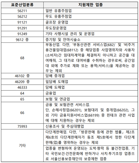 안심 금리 자금은 서울 소재 중소기업과 소상공인이면 누구나 신청할 수 있습니다. 그러나 아래와 같은 유흥업 및 도박·향락·투기 등 융자지원 제한업종은 지원에서 제외되었습니다.