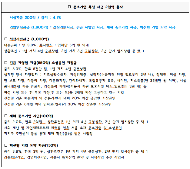 자금이 필요한 소상공인에게 적기에 자금을 지원하는 ‘중소기업 육성 자급’으로 서울시는 고정금리 자금을 2,000억 원 편성해 2.0~4.1% 금리로 공급하고, 변동금리로 7,000억 원이 소상공인 정책자금으로 지원 배정되었으며 서울시가 1.8% 또는 2.5% 금리를 보전해 자금을 이용하는 소상공인의 평균 예상 실 부담 금리는 3.8%로 보면 됩니다. 자금별로 업체당 최대 5억 원까지(성장 기반 자금) 가능합니다.