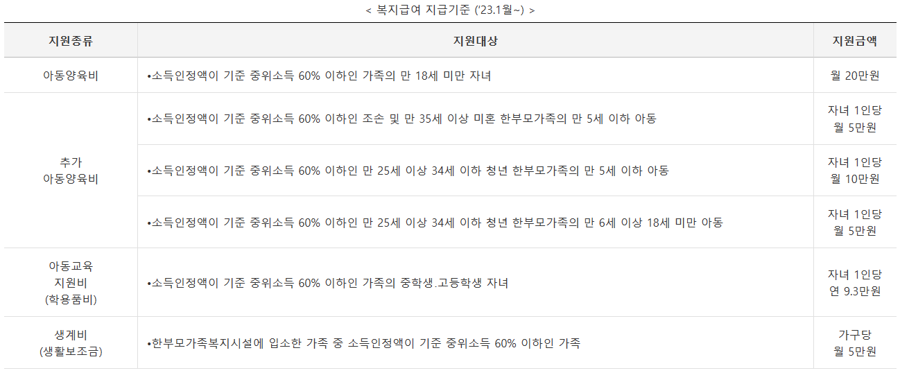 아동양육비는 소득인정액이 기준 중위소득 60% 이하인 가족의 만 18세 미만 자녀 1인당 월 20만원을 받을 수 있습니다.