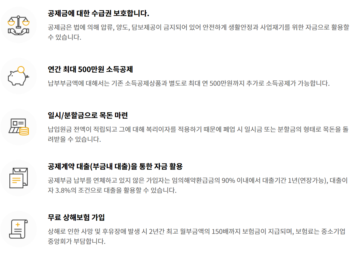 압류, 양도, 담보제공이 가능하면 내 통장에 돈이 들어온다고 해도 사용할 수 없는 상태가 되어버릴텐데, 공제금은 법에 따라 압류, 양도, 담보제공이 금지되어 있어 안전하게 생활안정과 사업 재기를 위한 자금으로 활용할 수 있어 안심할 수 있습니다.