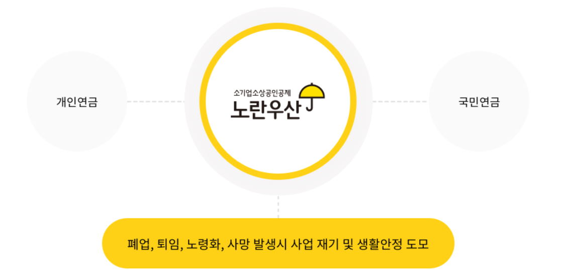 직장인이라면 회사를 두거나 은퇴할 때 퇴직금을 받지만, 자영업자는 따로 퇴직금이 없다 보니 폐업할 때 개인적으로 모아둔 돈이 없으면 어려움에 부닥칠 수 있습니다. 따라서 소상공인의 사회적 안전망 역할을 목적으로 노란우산공제라는 이름으로 중소기업중앙회가 운영하고 비영리 법인인 중소벤처기업부에서 관리하는 소기업·소상공인 공제제도를 설립하였습니다.