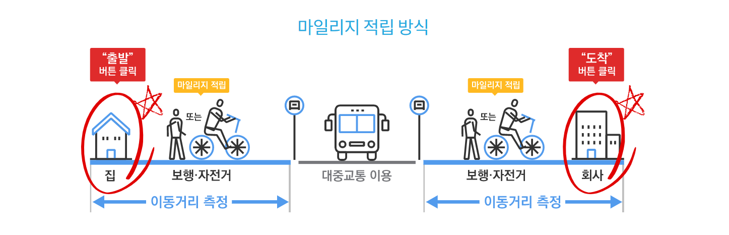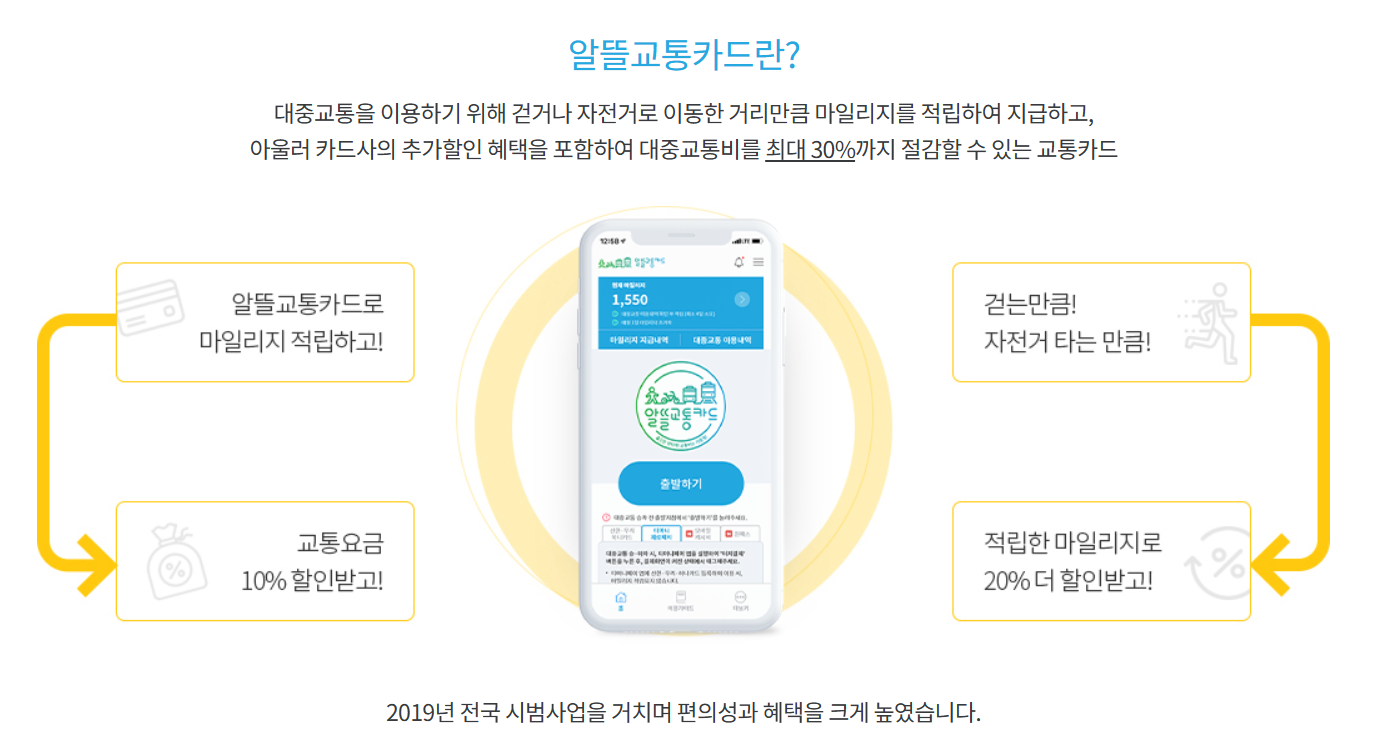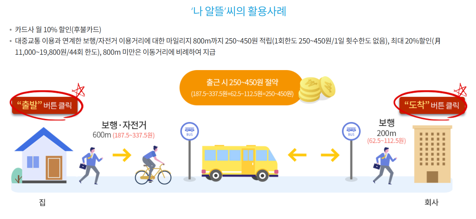 대중교통을 이용하기 위해 걷거나 자전거로 이동한 거리만큼 마일리지를 적립하여 지급받는 방법인데요. 카드사의 추가할인 혜택까지 포함하면 대중교통비를 최대 30%까지 절감할 수 있는 교통카드라고 합니다.