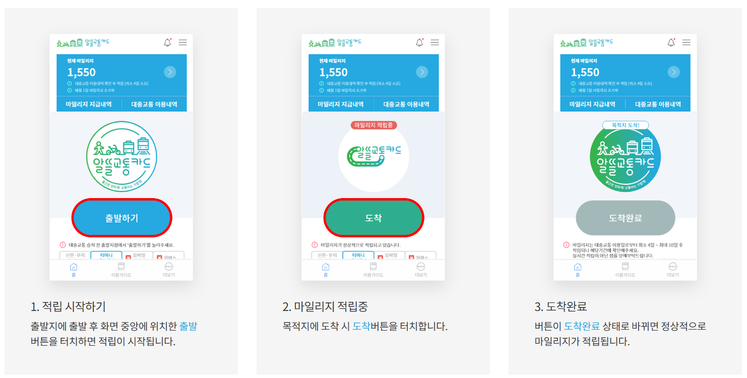 일단, 앱을 다운로드하여 출발할 때 출발 버튼과 도착한 후 도착 버튼을 누르면 출발지에서 대중교통 승차지점까지 걷거나 자전거를 통해 이동한 거리 측정하고, 대중교통 하차지점에서 도착지까지 걷거나 자전거를 통해 이동한 거리 측정한 후 카드사(신용카드 및 티머니)로부터 대중교통 이용정보 수신하여 대중교통 이용정보와 알뜰교통카드 앱 출발/도착정보 일치하는지 확인하여 정보가 일치하면 이동거리에 비례하여 마일리지 적립하는 방식입니다.