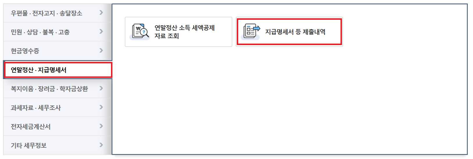 왼쪽에 있는 메뉴 중 연말정산 지급명세서를 클릭한 후 지급명세서 등 제출 내역을 눌러줍니다.