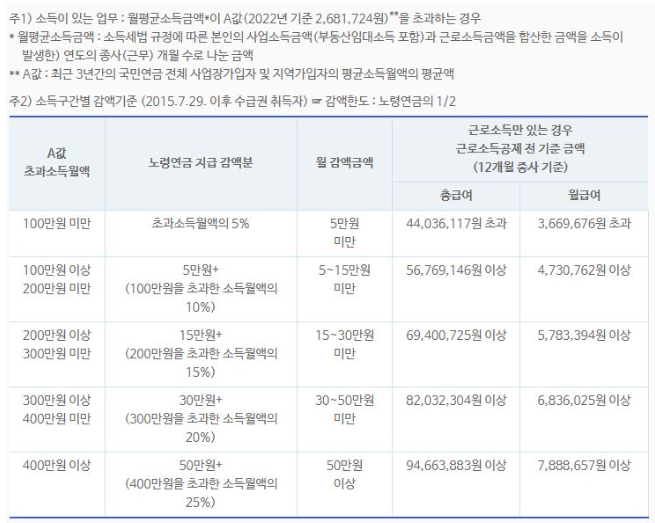 ※ 이때, 사업 소득금액과 근로소득금액을 합한 금액을 당해연도 종사 월수로 나눈 금액이 전년도 연말 기준 산정된 연금 수급 전 3년간의 전체 가입자의 평균 소득월액의 평균액보다 많은 경우가 소득이 있는 업무에 해당합니다. 2022년은 기준금액은 월 2,681,724원이니 참고해 주세요.