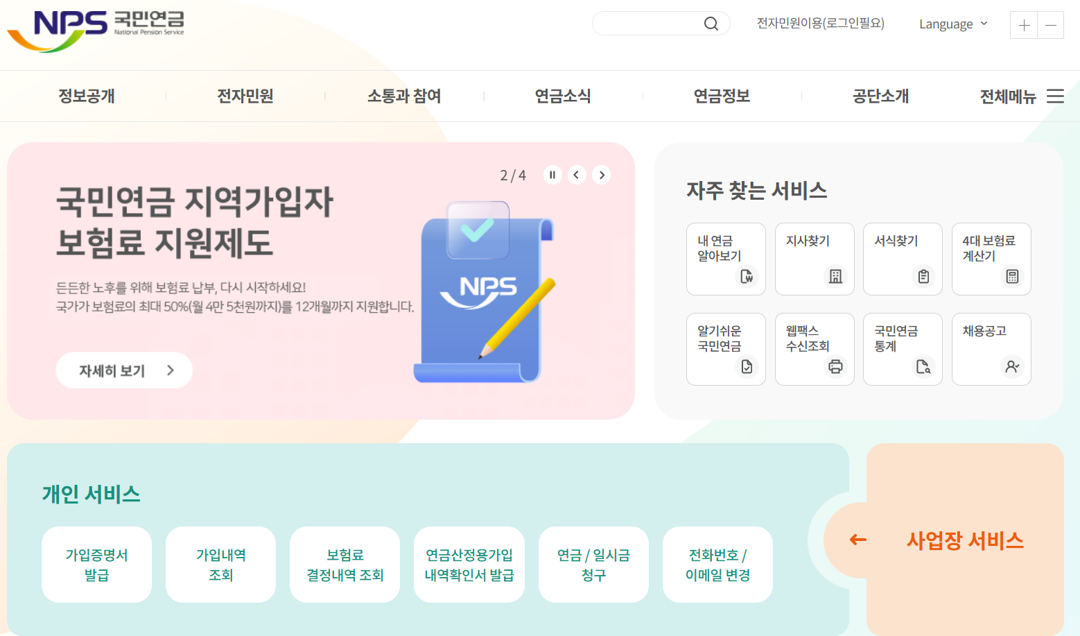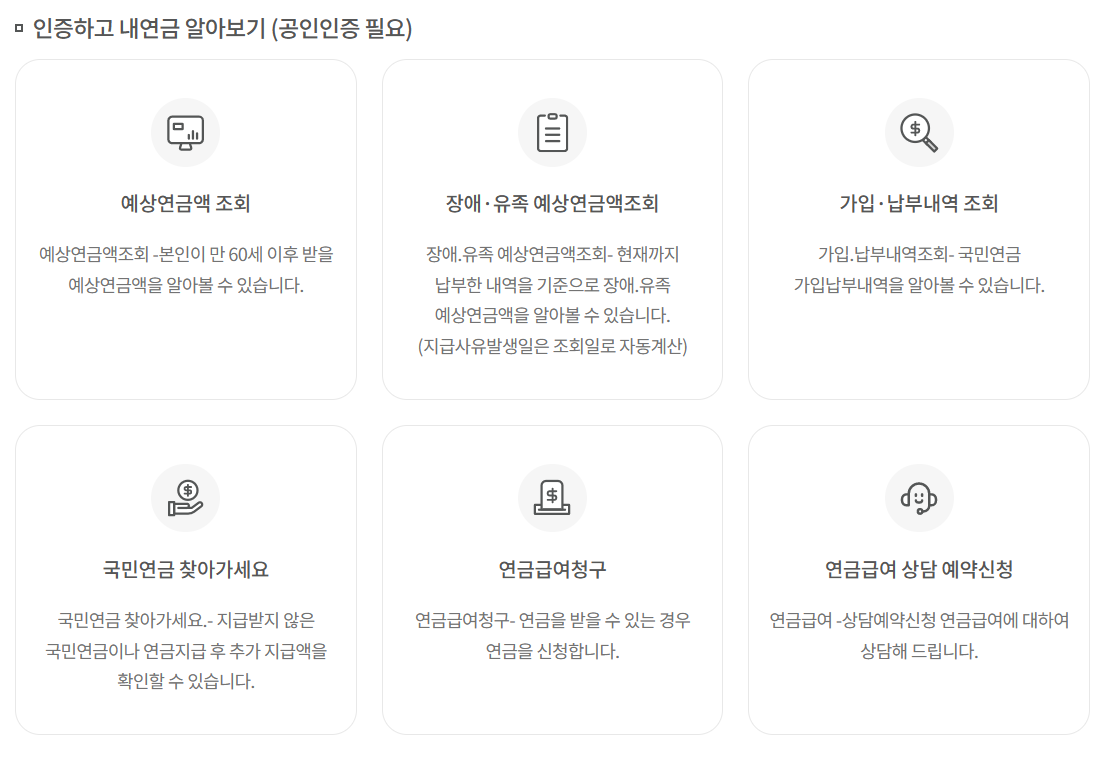 또한 공인인증을 통하여 만 60세 이후 받을 수 있는 예상 연금액을 확인하고 가입, 납부내역을 조회할 수도 있으니 국민연금공단 홈페이지를 참고해 주세요.