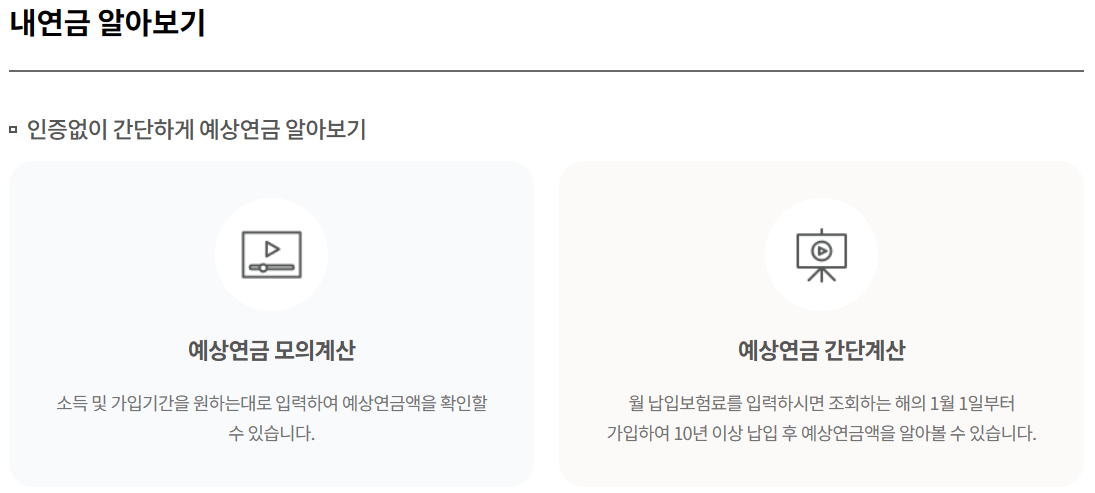 국민연금공단 홈페이지에 들어가서 ‘내 연금 알아보기’를 누르면 인증 없이도 소득 및 가입기간을 설정하여 예상 연금액을 확인하거나 월 납입 보험료를 입력하여 10년 이상 납입 후 예상 연금을 간단하게 계산할 수도 있습니다.