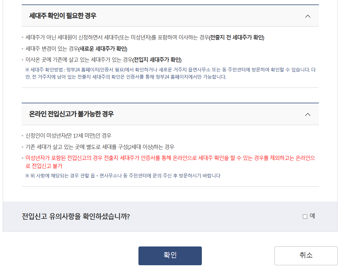 전입신고 시 유의 사항이 나오는데 이를 확인하고 확인을 눌러줍니다.