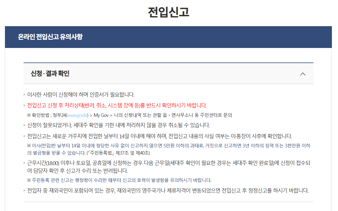 전입신고는 새로운 거주지에 전입한 날부터 14일 이내에 이사한 사람이 직접 신청해야 합니다. 근무시간인 18시 이후나 토요일, 공휴일에 신청하게 되면 다음 근무일에 접수되어 담당자 확인 후 신고가 수리 또는 반려되니 주의해 주세요.