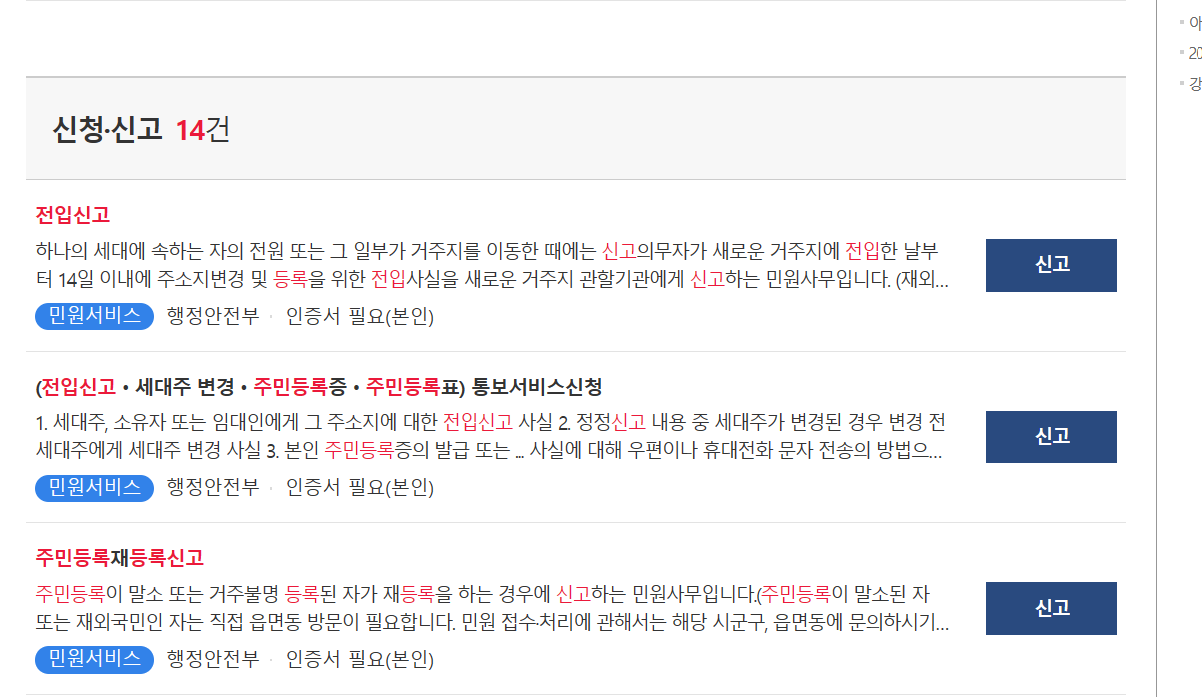 전입신고 오른쪽에 있는 신고를 눌러주세요.