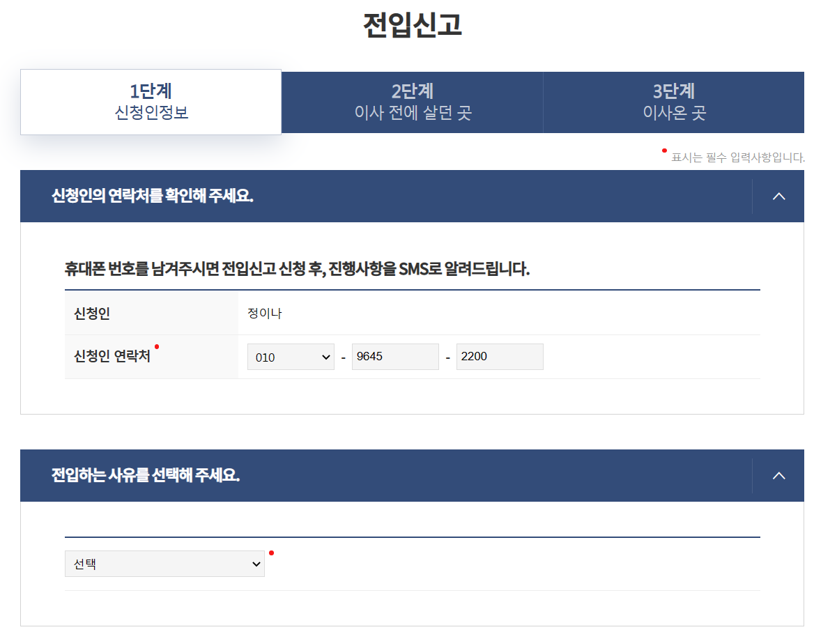 이후 전입신고를 이어 진행합니다. 신청인 정보, 이사 전에 살던 곳, 이사 온 곳을 순차적으로 기입하고 확인을 누르면 전입신고가 완료됩니다.