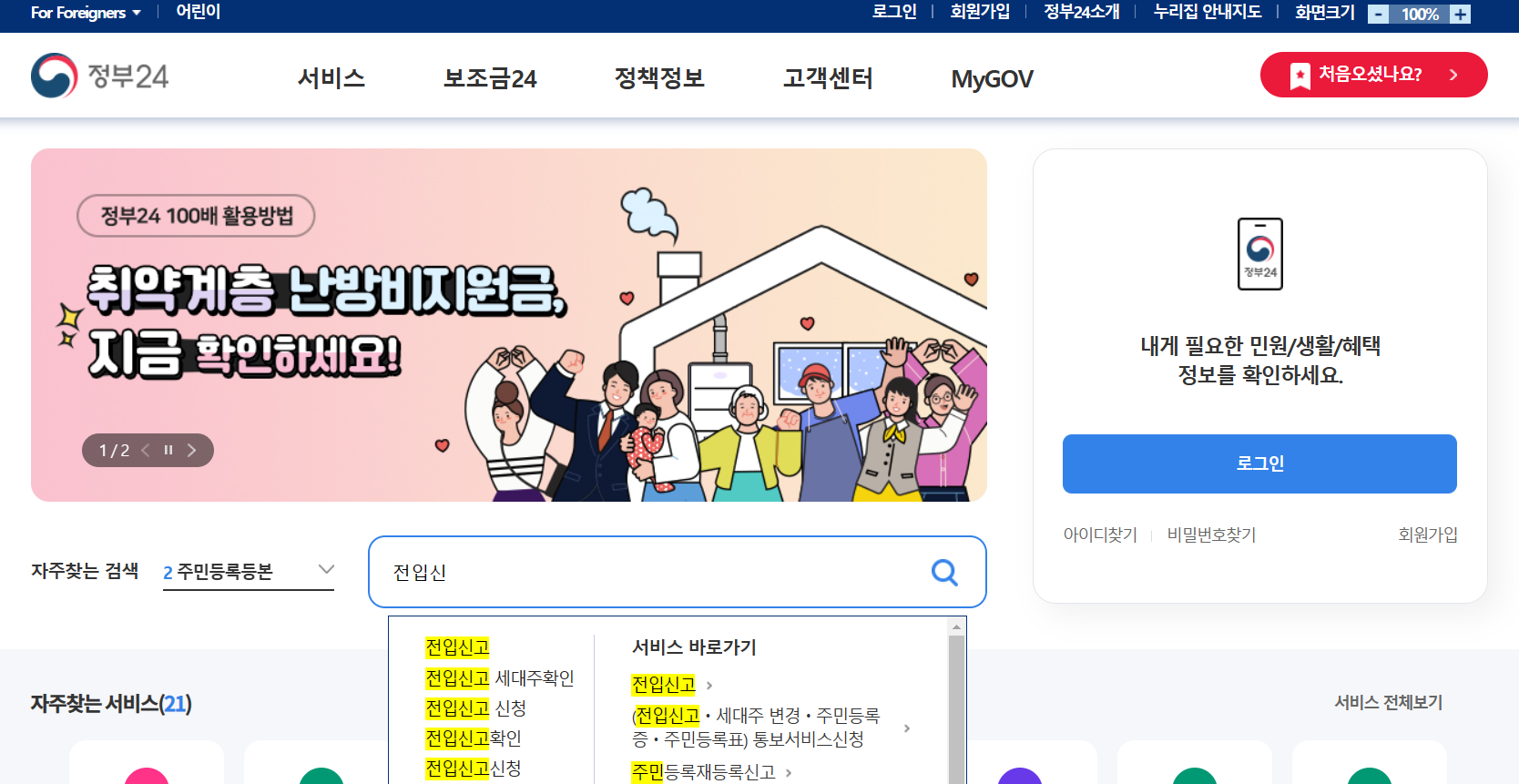 정부24에 접속하여 로그인한 후 가운데 있는 검색에 전입신고를 검색해줍니다.