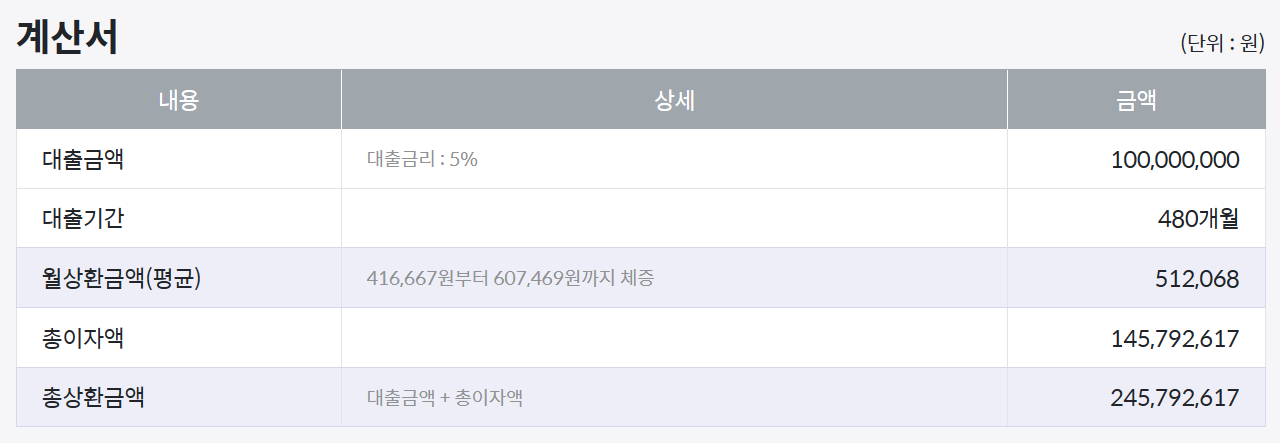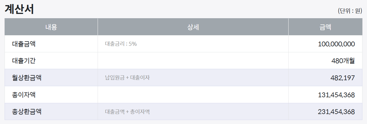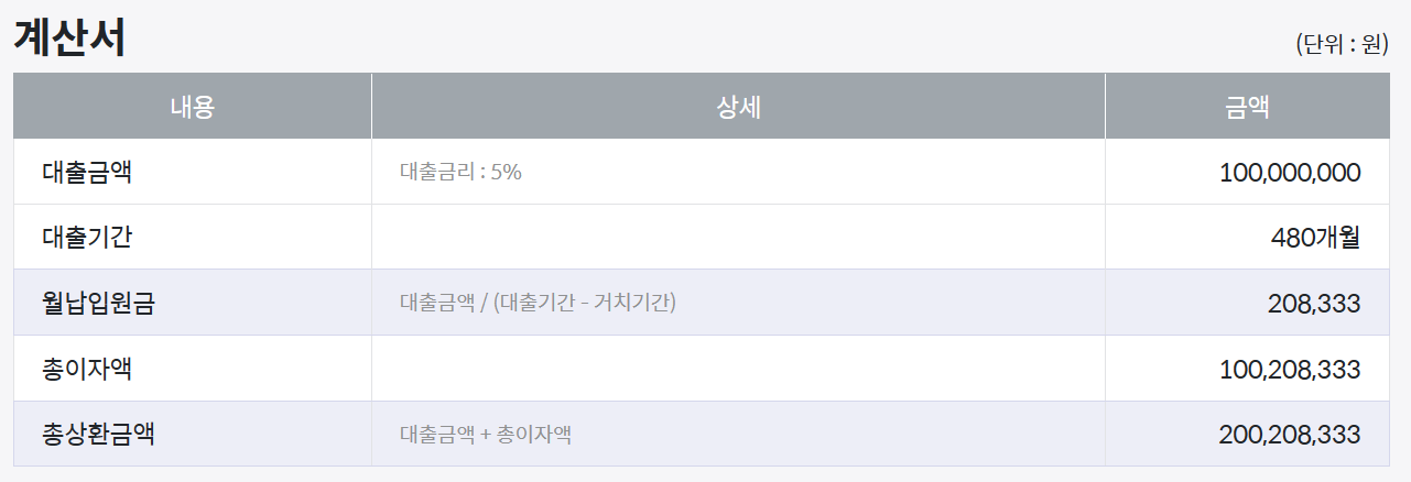 계산의 편의를 위해 1억으로 정하고 대출 기간은 40년으로 480개월, 그리고 대출금리는 5%로 설정하겠습니다.