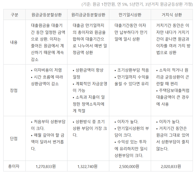 원금균등상환, 원리금균등상환, 만기일시상환, 거치식 상환 비교