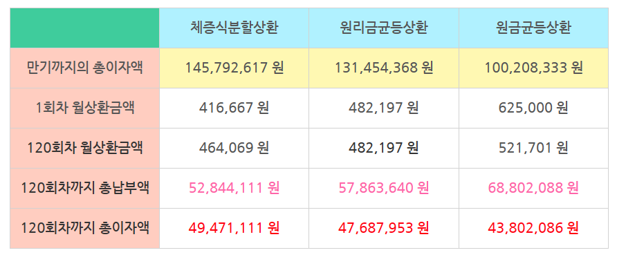 120회차까지 살펴보면 체증식이 매월 상환해야 하는 금액과 총납부액이 가장 적음을 알 수 있습니다. 총이자액은 겨우 1,783,158원밖에 차이 나지 않기 때문에 부담도 가장 적다고 볼 수 있습니다.