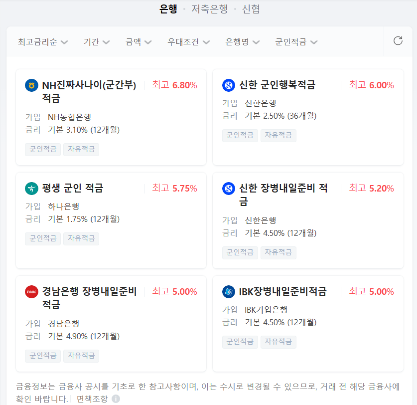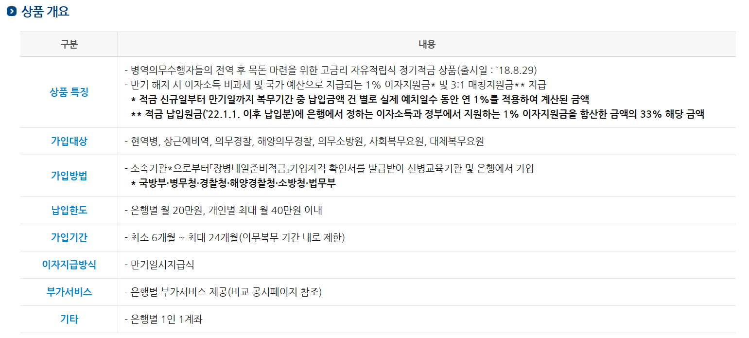 최소 6개월 이상으로만 계약 가능한 상품이므로 전역 기간이 적어도 6개월 이상 남아야 가입할 수 있습니다. 은행별로 1인 1계좌를 만들 수 있으며 적금 만기 설정은 전역일에 맞춰야 합니다.