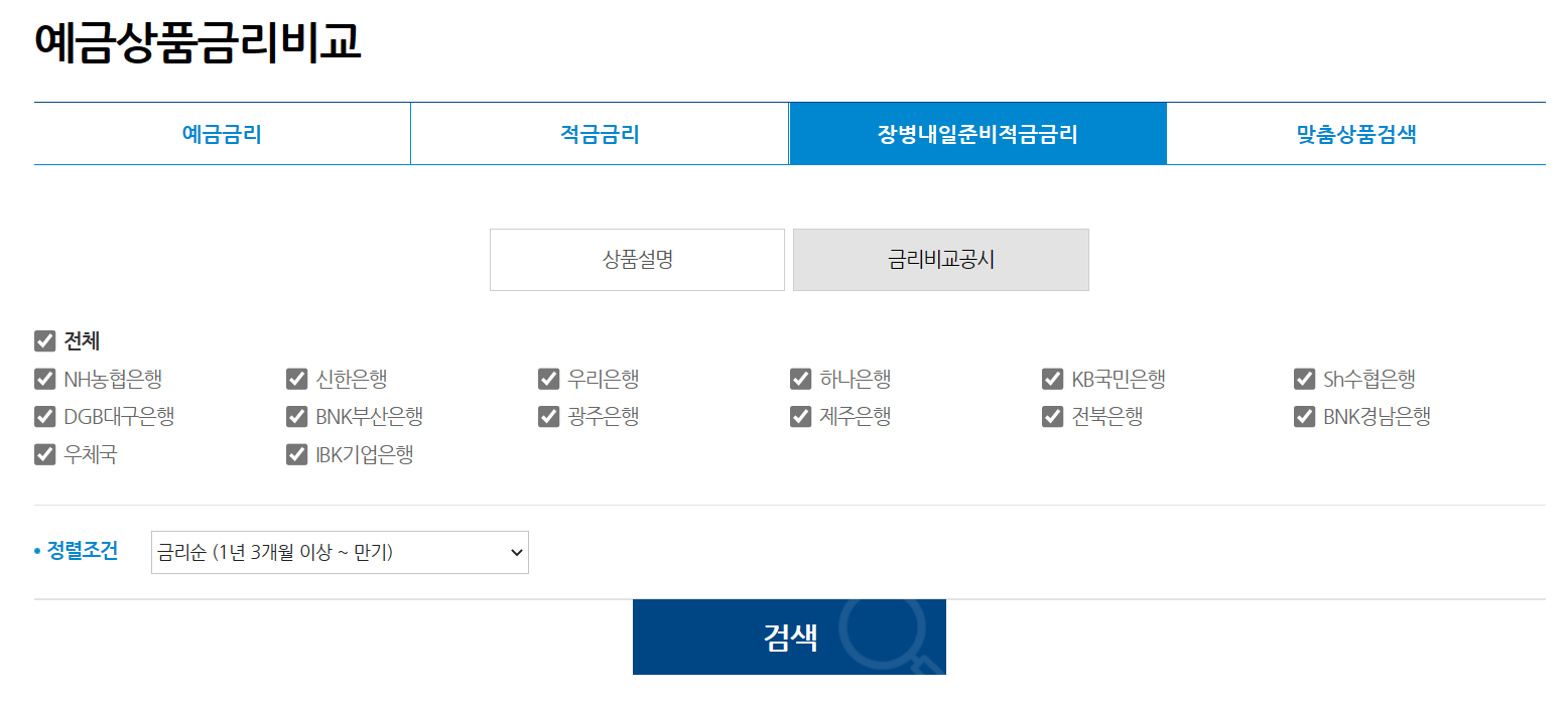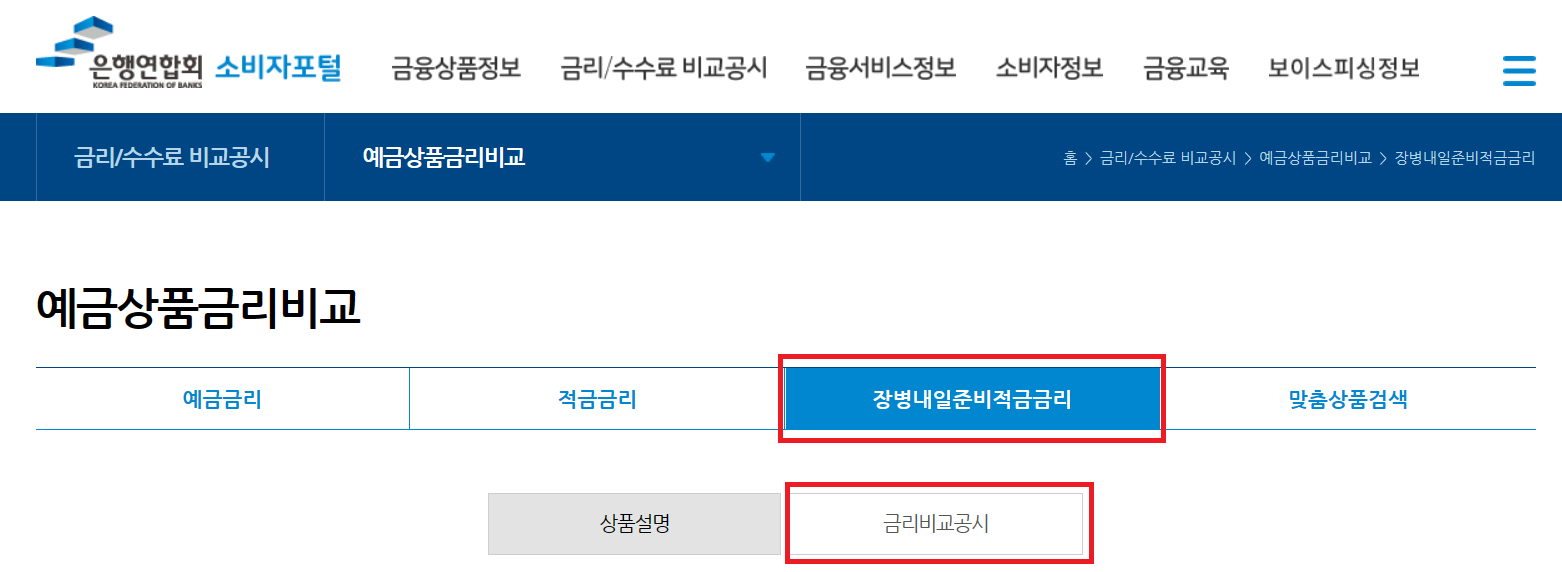 ‘은행연합회 소비자포털'에서도 예금 상품들의 금리를 비교할 수 있습니다. 은행연합회 소비자포털 사이트에 접속하여 순서대로 클릭하면 '장병내일준비적금' 상품들의 금리를 비교할 수 있습니다.