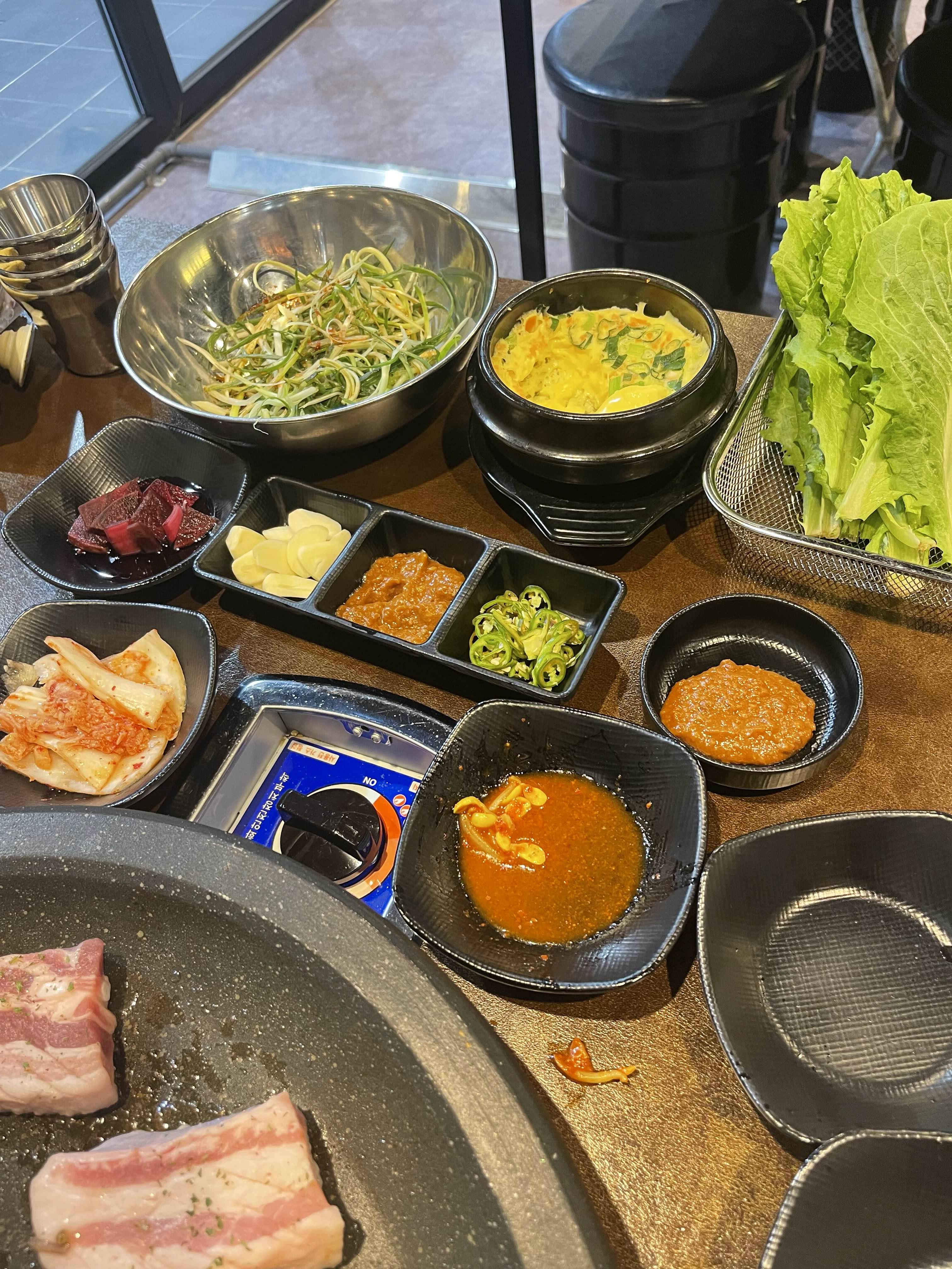 각종 반찬들인데요.. 콩나물은 이미.. 불판위에 올려버렸네요. 계란찜은 이제 놓칠수 없는 반찬이죠!! 없으면 서운할 정도예요!! 냠냠 맛있게 먹습니다!!! 아까 팥빙수 제공 보셨나요?? 팥빙수 주문을 한 번 해보았는데요!!