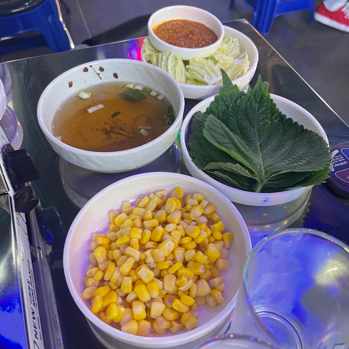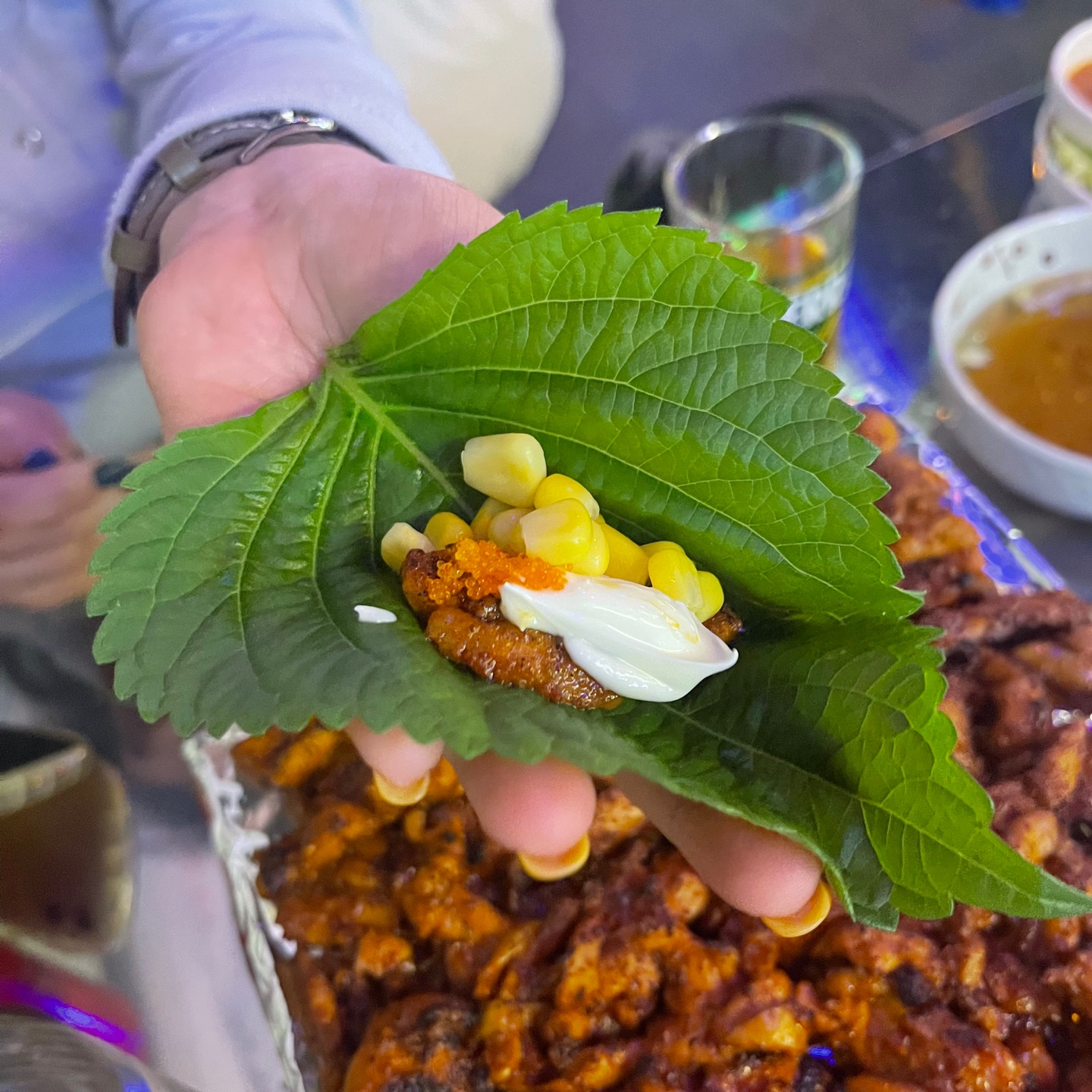깻잎에 닭구이 한 점을 올리고 마요네즈와 날치알을 듬뿍 얹은 다음 기본 반찬으로 나온 옥수수와 함께 쌈을 싸먹으면,, 이 조합 완전 굿!!!! 놓칠 수 없어요!! 저희 깻잎을 얼마나 더 달라고 했는지 몰라요!!! 완전 만족스러운 금요일 저녁이었습니다.