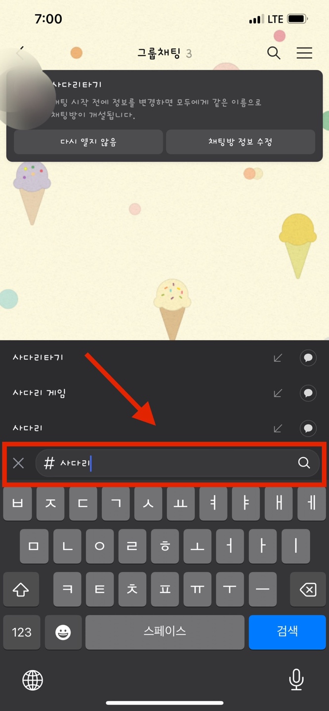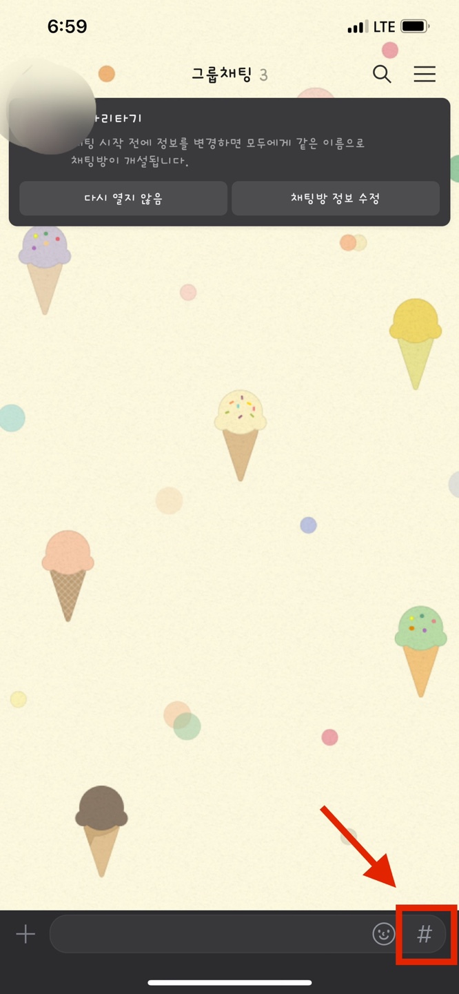 채팅방이 만들어졌으면 오른쪽 하단에 있는 # 모양의 아이콘을 눌러 사다리타기를 검색해서 선택합니다.