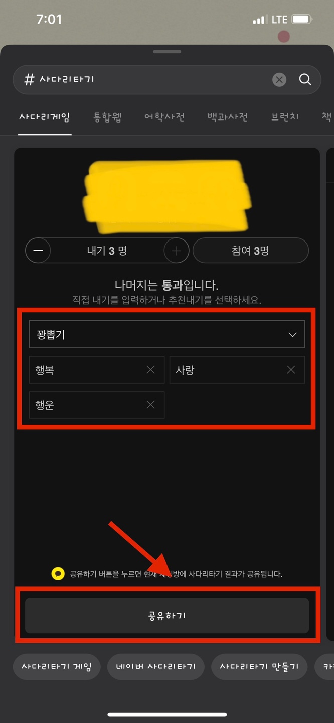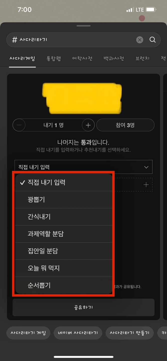 참여 인원을 선택하면 <꽝뽑기>라고 적인 메뉴 밑에 이름을 변경할 수 있는데요. 원하는 이름으로 변경해주시면 그 이름이 우리가 종이로 사다리타기할 때 밑에 적었던 항목들이 되는거예요!! 항목을 설정했으면 공유하기를 눌러줍니다.