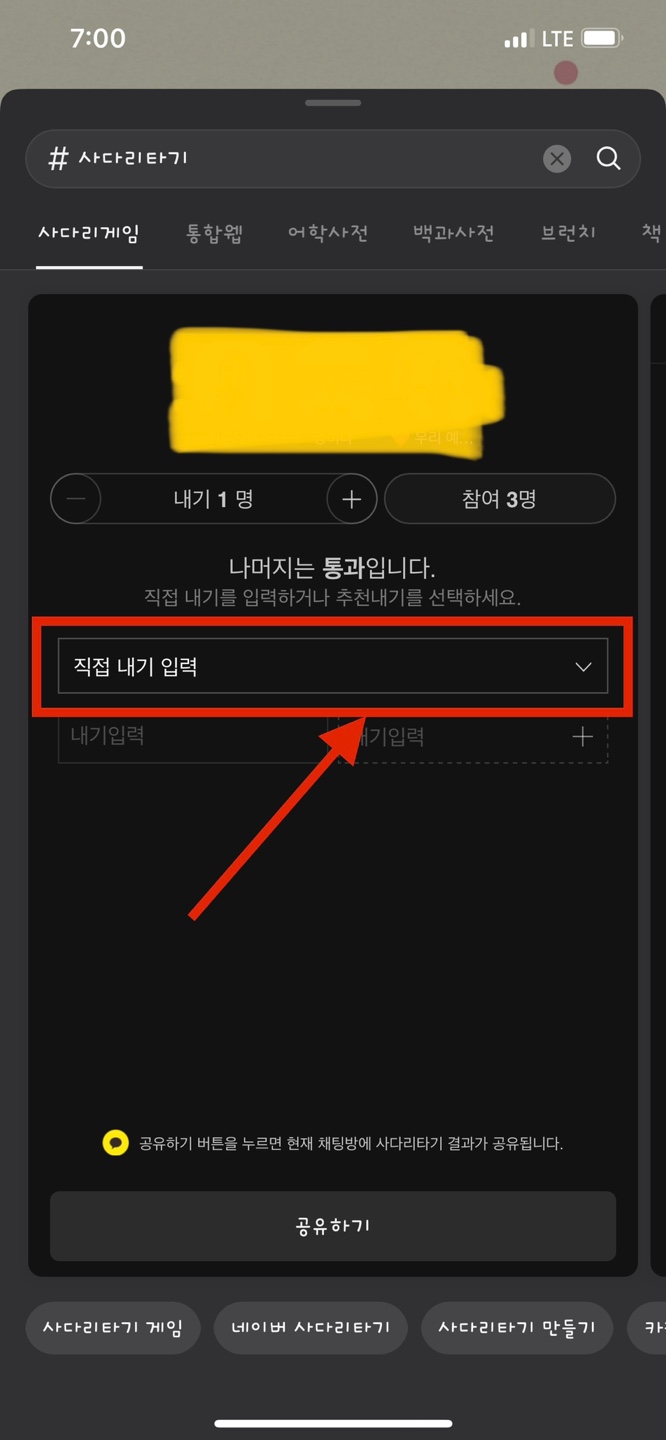그럼 가운데 부분에 <직접 내기 입력>이라는 선택란이 보이죠. 그 부분을 누르면 사다리타기를 할 수 있는 다양한 메뉴가 나옵니다. 원하는 메뉴를 선택하세요. 저는 꽝뽑기를 선택해볼께요!!!