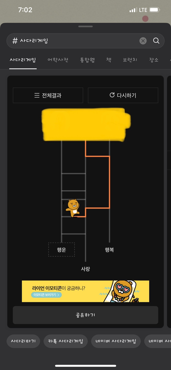 단톡방에 사다리타기가 공유되었죠!! 전체 결과 확인하기를 눌러주세요. 그러면 사다리타기 그림이 나오고 캐릭터들이 사다리를 타면서 결과를 알려줍니다!!