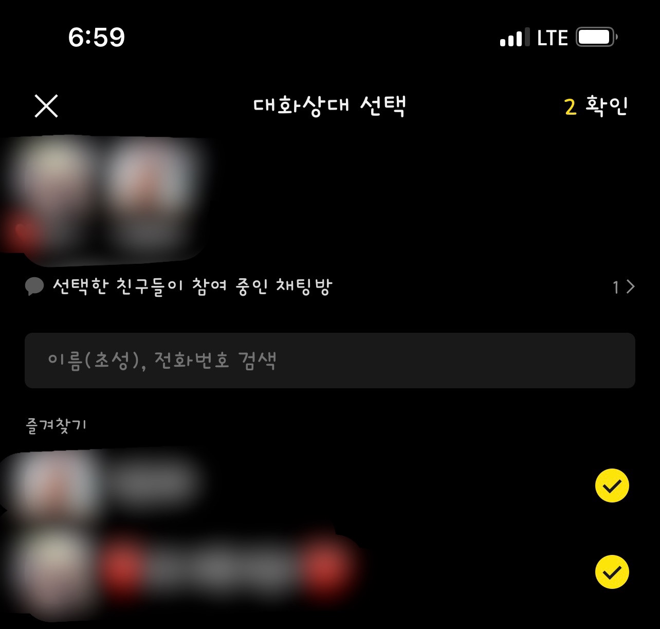 일반 채팅방을 만들기 위해 참여할 대화상대를 선택하고 오른쪽 상단의 확인을 눌러주세요.