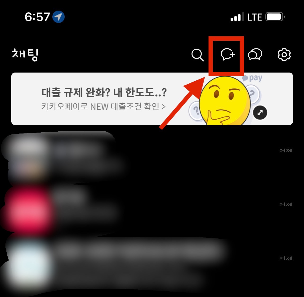 일단 카카오톡 앱을 열어 사다리타기를 하고자 하는 채팅방에 들어가거나 새로운 채팅방을 만들어줍니다. 새로운 채팅방을 만드는 방법은 오른쪽 위에 있는 말풍선 모양에 플러스 표시가 되어 있는 아이콘을 눌러 만들 수 있습니다.