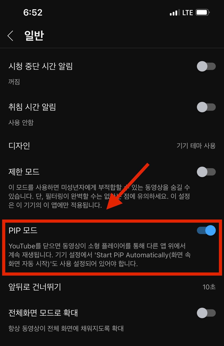 화면 속 화면 자동 시작 버튼까지 켜 주시면 유튜브 백그라운드 재생 PIP모드 사용 준비는 끝입니다.