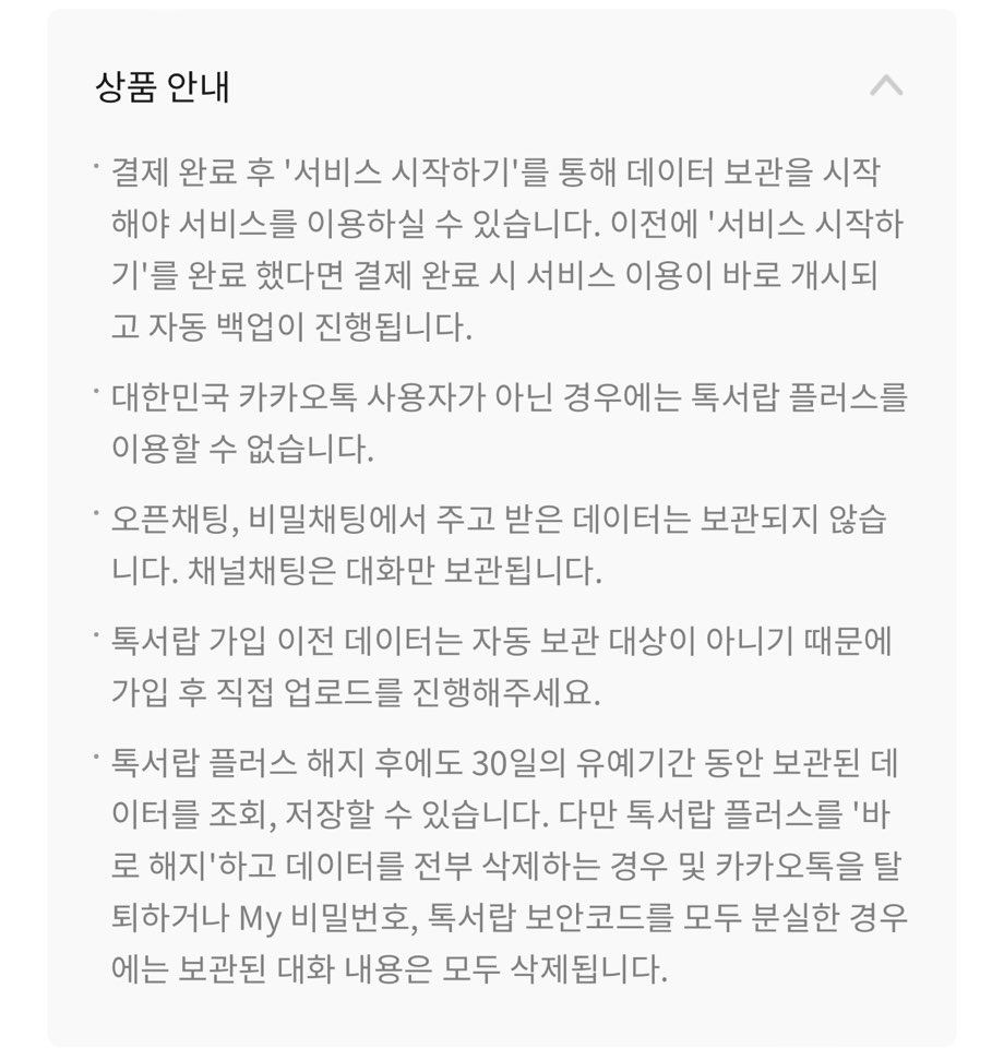 오픈채팅, 비밀채팅에서 주고 받은 데이터는 보관되지 않기 때문에 주의해 주시구요. 더불어 채널채팅은 대화만 보관된다는 것 기억해주세요. 톡서랍 가입 이전 데이터는 자동 보관 대상이 아니므로 직접 업로드 해주시구요.