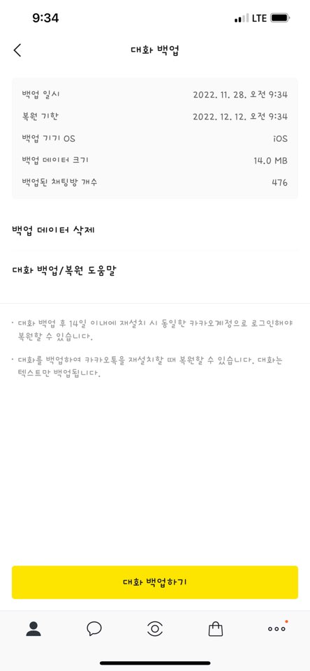 대화 백업이 완료되었습니다. 대화 백업 후 14일 이내에 재설치 시 동일한 카카오 계정으로 로그인해야 복원할 수 있으므로 백업 일시와 보관 기한을 잘 기억해주세요!!!
